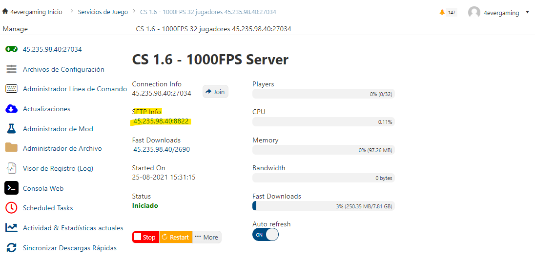 - Allí ubicamos los datos de conexión requeridos en un formato IP:PUERTO. Fijate que la IP se ubica del lado izquierdo y el puerto del lado derecho, hacer esta distinción nos servirá en otro paso.