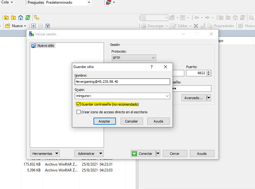 NOTA: en Filezilla en Servidor anteponer el prefijo "sftp://" a la ip para poder conectarse - Una vez que terminamos de ingresar los datos de conexión, damos click en guardar y tildamos la opción "Guardar contraseña". De esta forma la próxima vez que querramos conectarnos lo hará de manera automática.